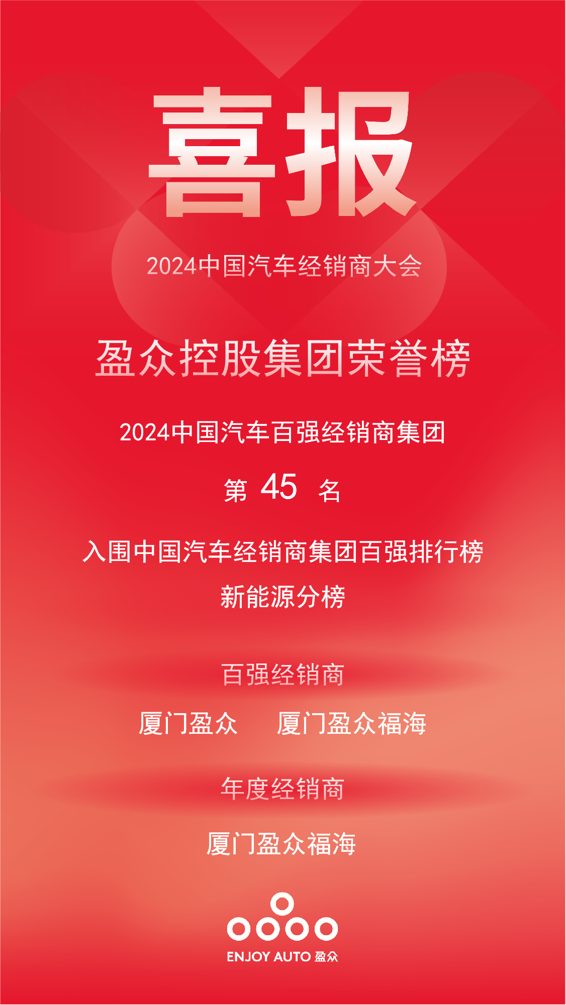 會(huì)上,中國(guó)汽車流通協(xié)會(huì)發(fā)布了“2024中國(guó)汽車經(jīng)銷商集團(tuán)百?gòu)?qiáng)排行榜”,盈眾控股集團(tuán)憑借營(yíng)收規(guī)模、盈利能力等指標(biāo)上的優(yōu)異表現(xiàn),成功入選,位列第45位。