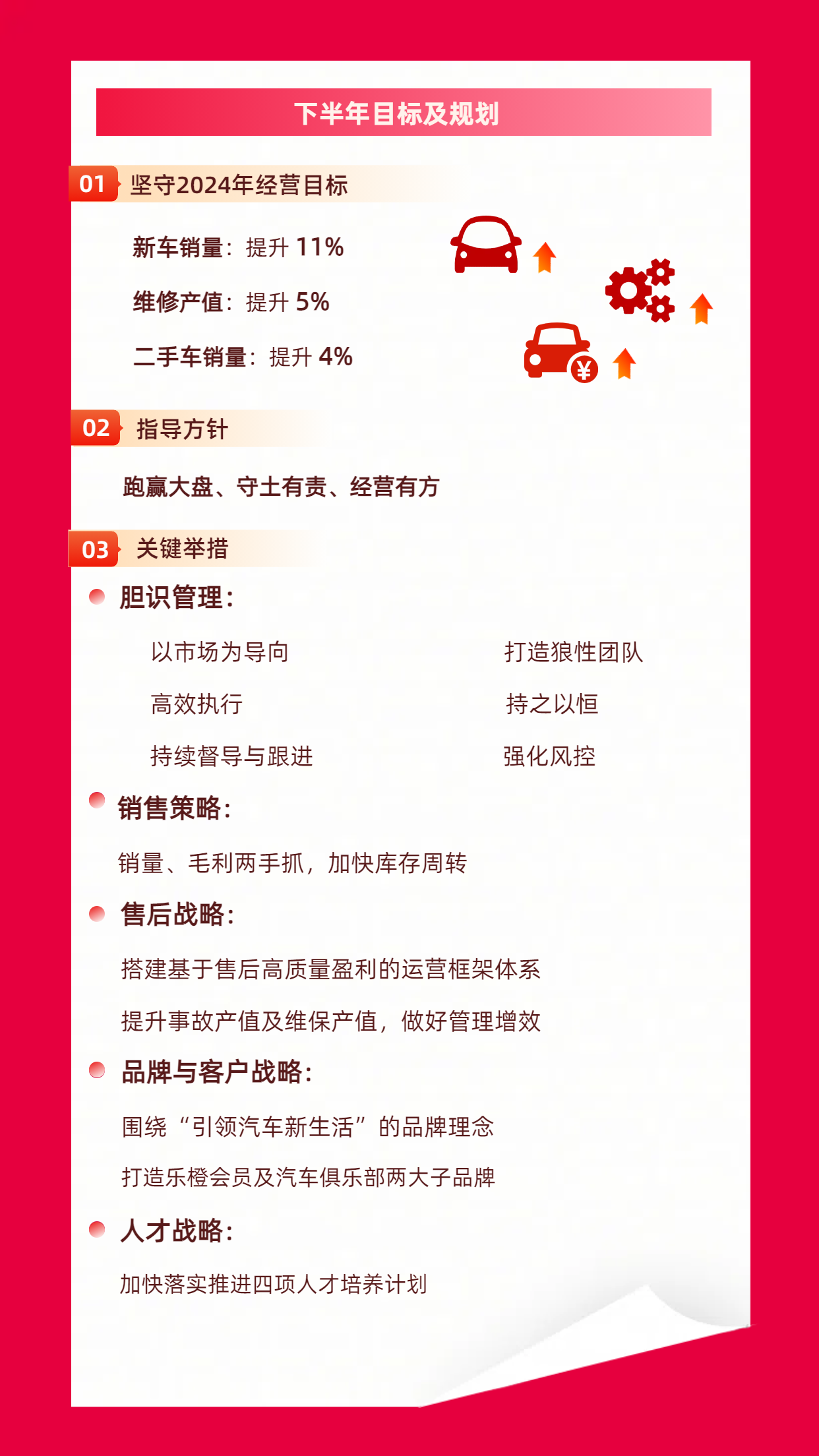 展望下半年,易總再次重申了2024年經(jīng)營目標,提出“跑贏大盤、守土有責、經(jīng)營有方”的指導方針,并圍繞膽識管理、銷售策略、售后策略、售后戰(zhàn)略、品牌與客戶戰(zhàn)略、人才戰(zhàn)略提出系列關鍵舉措。