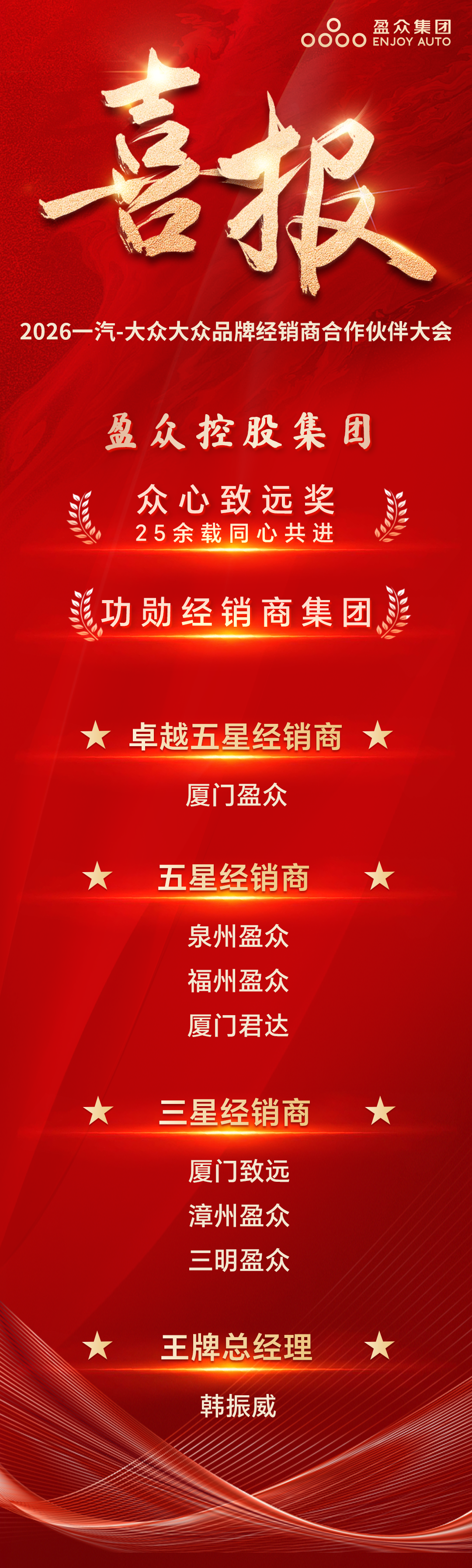 喜報(bào) | 盈眾榮獲2025年度一汽-大眾功勛經(jīng)銷商集團(tuán)、卓越五星經(jīng)銷商、五星經(jīng)銷商、王牌總經(jīng)理等多項(xiàng)大獎(jiǎng)
